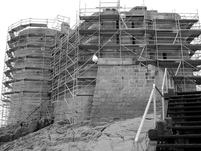 Vue de la restauration du château du Taureau : rejointoiement de l'élévation sud (avril 2001)Immatriculation