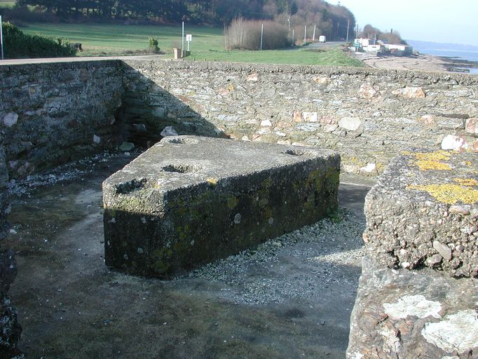Vue de l'une des cuves pour canon antiaérien de 4 cm : soubassement de forme triangulaire servant de support à l'affût (état en 2002)Immatriculation