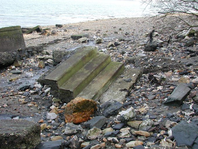 Vue des vestiges disloqués sur l'estran de l'une des quatre cuves pour canon antiaérien de 4 cm : escalier d'accès (état en 2002)Immatriculation