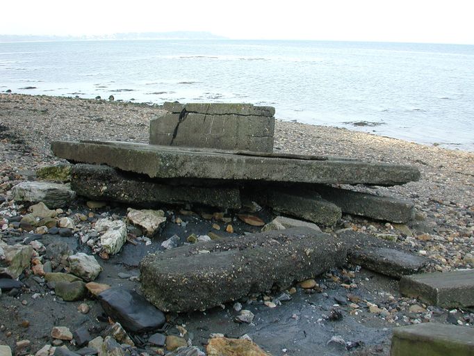 Vue des vestiges disloqués sur l'estran de l'une des quatre cuves pour canon antiaérien de 4 cm (état en 2002)Immatriculation
