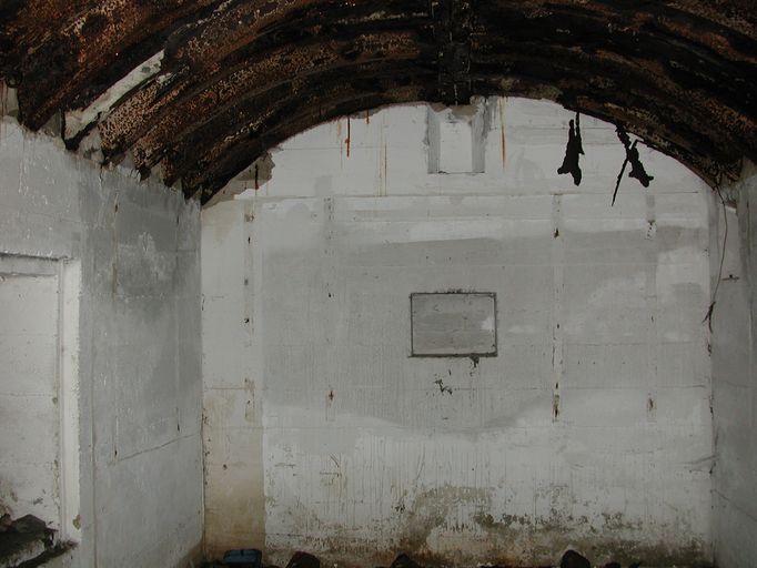 Vue intérieure (état en 2002). Il s'agit d'un abri type "tôle métro" : au fond de la pièce, deux niches murales ; à gauche, la sortie de secoursImmatriculation