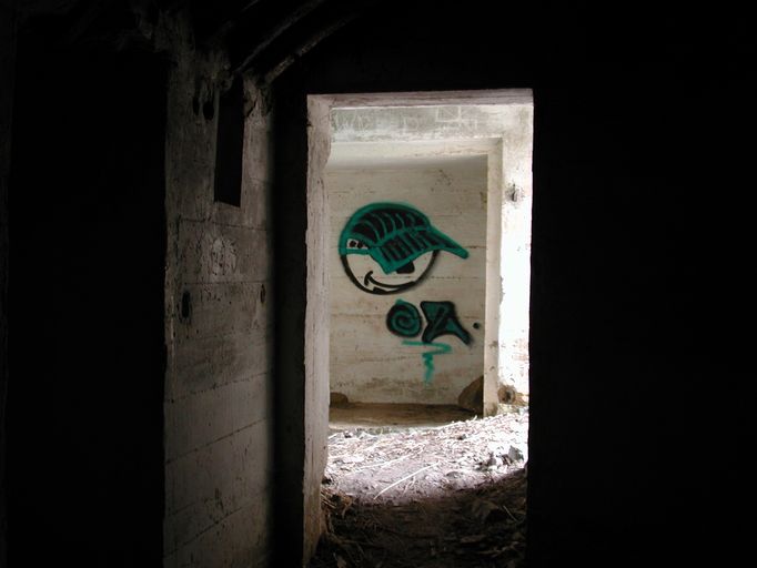 Vue intérieure : porte donnant sur le couloir d'accès et son tag (état en 2002)Immatriculation