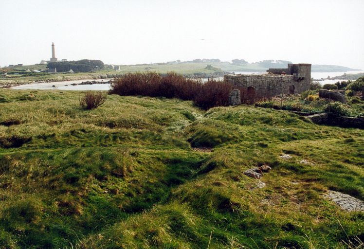 Vue générale des tranchées (état en 2002). En arrière-plan à droite, le corps de garde crénelé ; à gauche, le phareImmatriculation