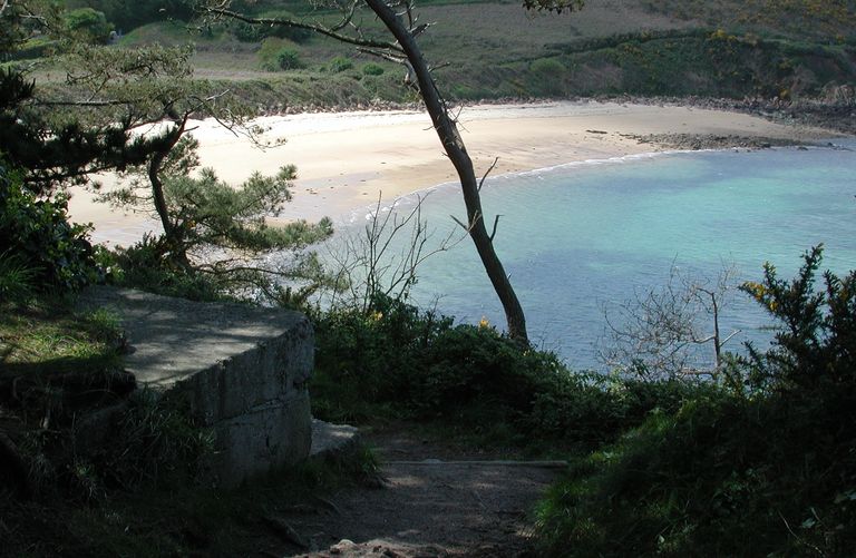 Vue de situation depuis le chemin côtier (état en 2002). En arrière plan, la plage du CosmeurImmatriculation