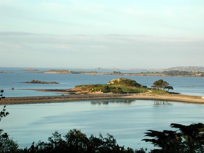 Vue de l'îlot Sainte-Anne à Saint-Pol-de-Léon depuis le Champ de la Rive. Une batterie de côte était positionnée sur l'îlot tandis que le corps de garde se trouvait au Champ de la RiveImmatriculation
