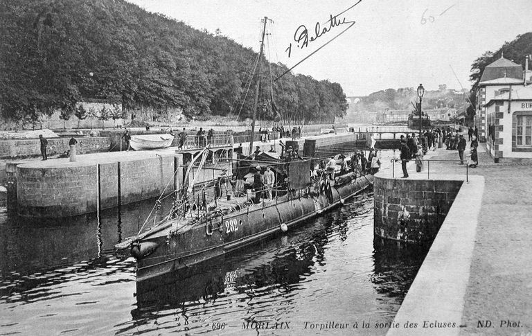 Morlaix : vue générale du torpilleur à la sortie des écluses, carte postale ancienne, Bibliothèque Municipale de MorlaixImmatriculation