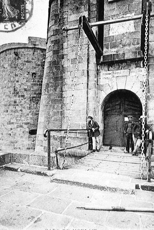 Vue du pont-levis du château du Taureau à la fin du 19e siècle, début 20e siècle, carte postale ancienne, collection particulièreImmatriculation