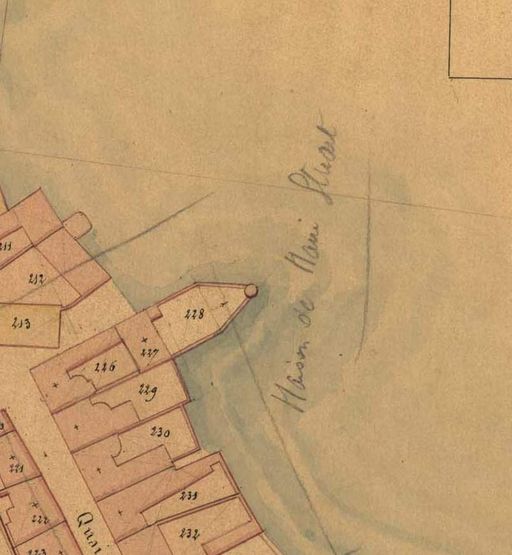 Extrait du cadastre parcellaire de Roscoff : maison dite de Marie Stuart avec son jardin clos et son échauguette/guérite donnant sur la mer, 1846Immatriculation