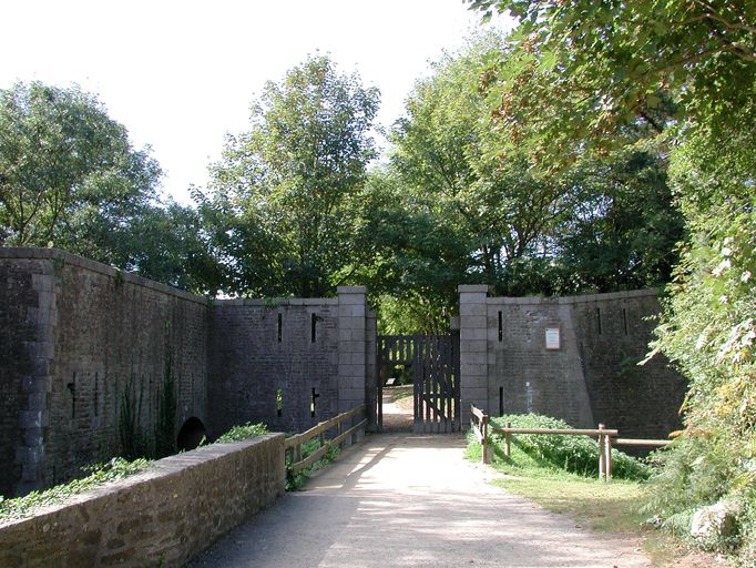 Vue du fort du Dellec : entrée monumentale et enceinte percée de créneaux de fusilladeImmatriculation