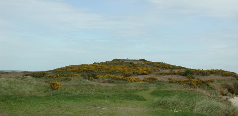 Vue des vestiges du double talus associé à des fossés (état en 2002). En arrière-plan sur la colline : la batterie de côteImmatriculation