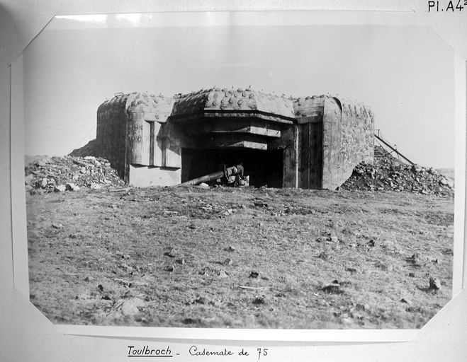 Vue générale de l'un des quatre bunkers - casemates, vers 1946-1947 (extrait du rapport Pinczon du Sel, photographie n° 94). La pièce d'artillerie est en placeImmatriculation