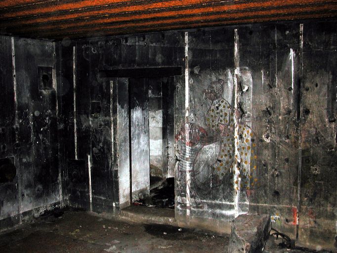 Vue de la salle de garde : unique entrée (état en 2002). Cette pièce est ornée de peintures murales : ici sur le mur sud, une grand-mère tirant par le bras un jeune garçonImmatriculation