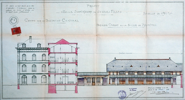 Projet d'école supérieure de jeunes filles, coupe sur le bâtiment central et façade ouest de la salle de réunions, dessin, par Leray, 1913 (A. C. Rennes).Immatriculation