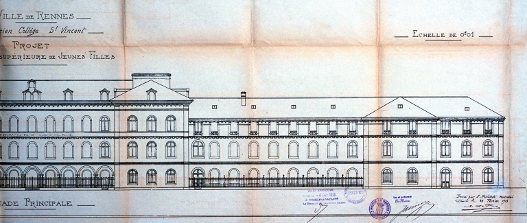 Pension Brecha, dite pensionnat de la Barre-Saint-Just, collège Saint-Vincent-de-Paul, école primaire supérieure et professionnelle de jeunes filles, actuellement lycée Jean Macé, 12 rue Jean-Macé (Rennes),
