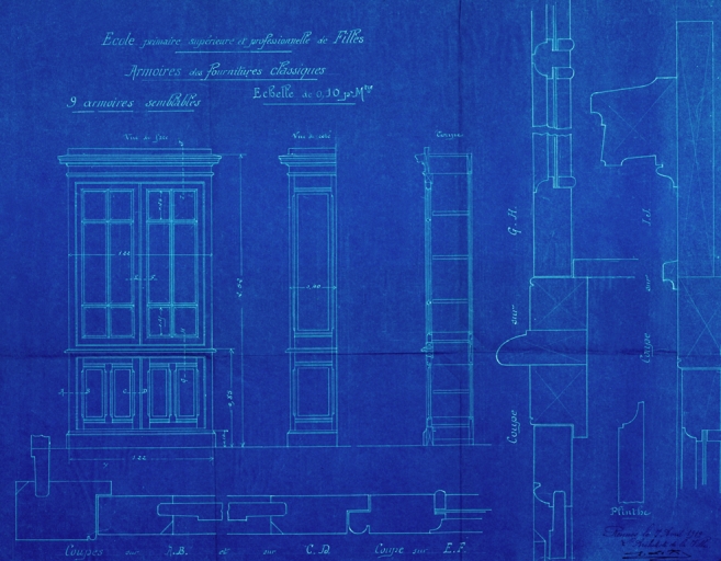 Armoires à fournitures, plan et coupe, 1919 (A. C. Rennes)Immatriculation
