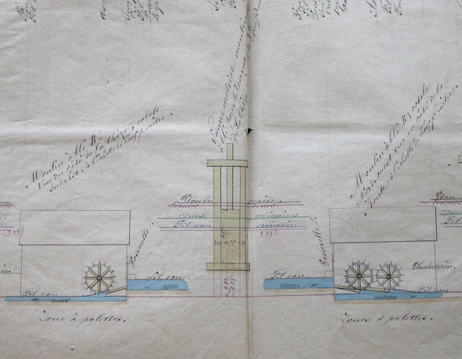 Elévations du moulin à blé actionné par trois roues à palettes (7 avril 1880).Immatriculation