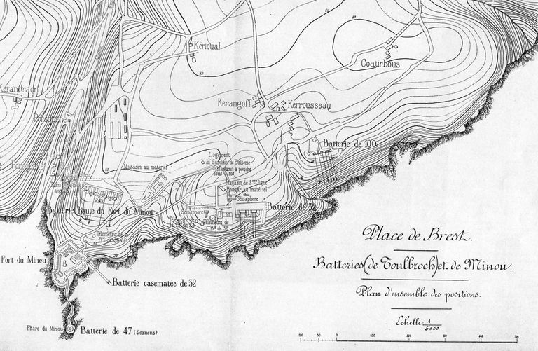 Plan d'ensemble des positions des batteries de Toulbroc'h et de Minou, Atlas des batteries de côte, n° 20 : place de Brest, 1913.
