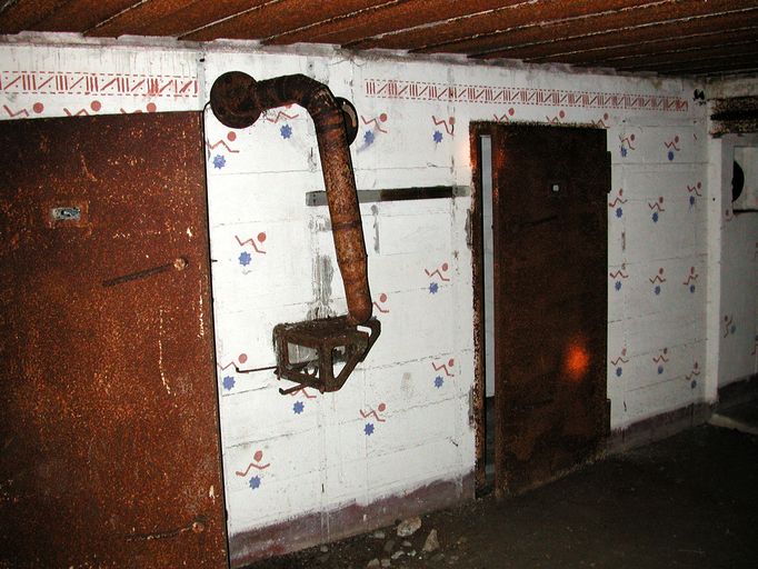 Vue du bunker - abri à personnel de type 128 des Quatre-Pompes : peinture murale allemande dans le style tapisserie avec frise géométrique assortieImmatriculation