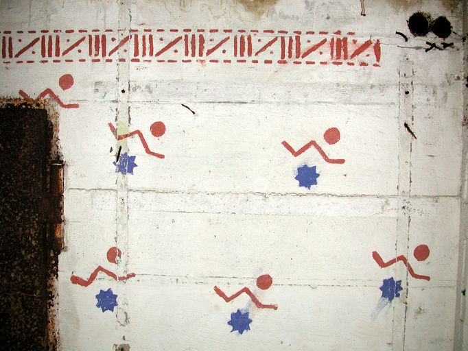 Vue du bunker - abri à personnel de type 128 des Quatre-Pompes : peinture murale allemande dans le style tapisserie avec frise géométrique assortieImmatriculation