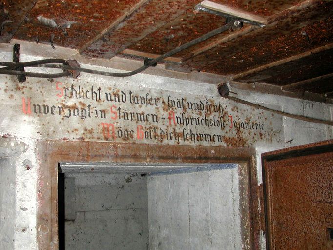 Vue de la casemate de type 515 de Maison Blanche : peinture murale allemande de propagande (traduction : Simple et Brave - Matin et Soir - Intrépide dans les assauts - Modeste infanterie, que Dieu te protège !)Immatriculation