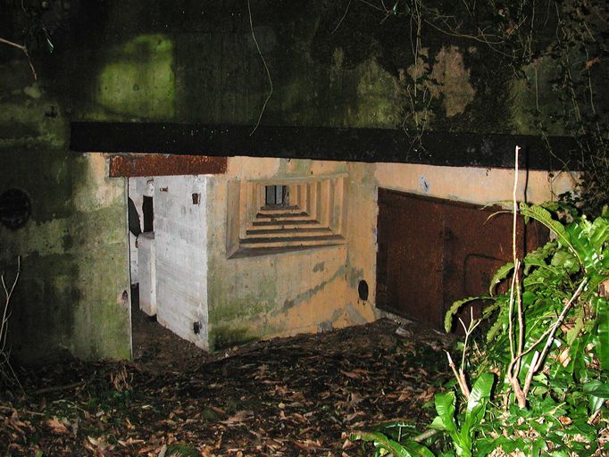 Vue de la casemate de type 505, flanquée par une caponnière de défense d'entrée, Le Coat, face au HildyImmatriculation