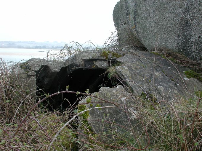 Vue de l'un des deux bunkers-abris nichés dans le chaos granitique (état en 2003). Il est partiellement envahi par la végétationImmatriculation