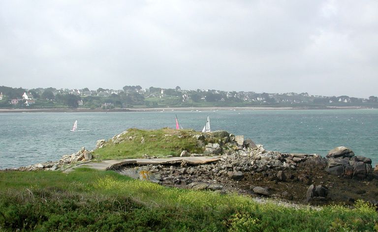 Vue de situation de la cale sud (état en 2002). L'îlot sud aurait été partiellement arasé durant la Seconde Guerre mondiale parce qu'il gênait le champ de tir de l'un des canons de 7,5 cm défendant l'Aber Wrac'hImmatriculation
