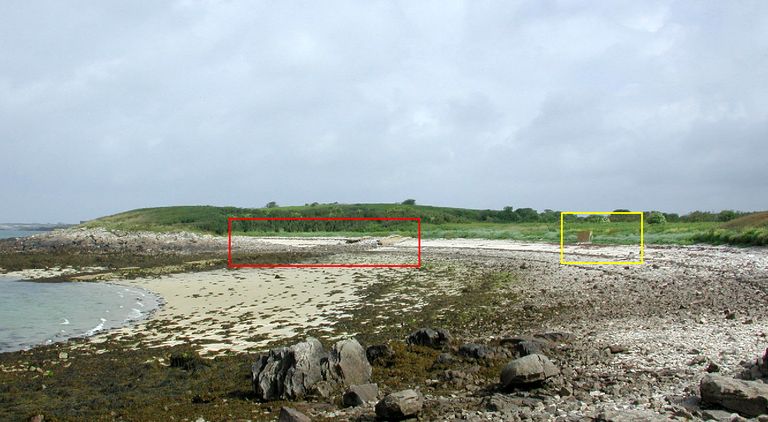 Vue générale de la grève sud-ouest. Encadré en rouge l'emplacement du slipway et en jaune des plots en béton armé (état en 2002)Immatriculation