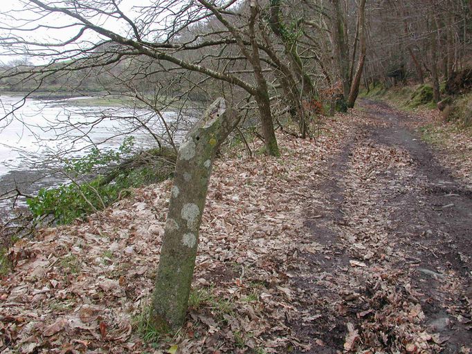 Vue d'un poteau en béton implanté en contrebas du bois de Ploujean face au Dourduff (état en 2003). Il s'agit d'un élément de tétraèdre (type d'obstacle en préfabriqué)Immatriculation