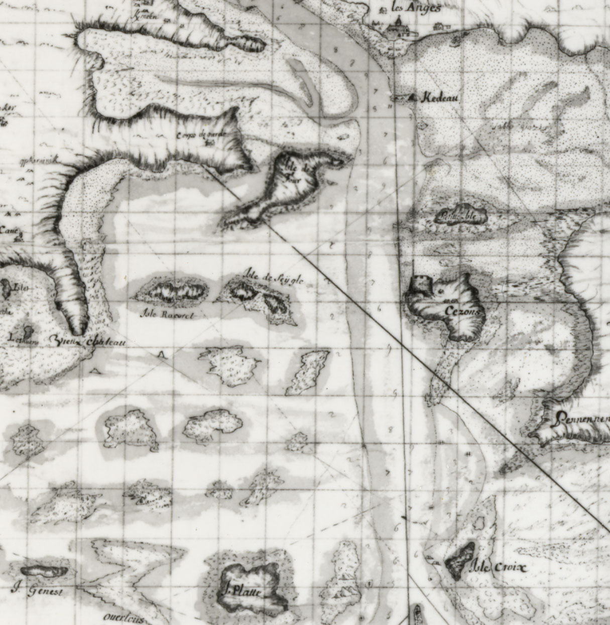 Extrait de la carte particulière des rivières d'Aber Wrac'h et Aber Benoît et environs, par monsieur le chevalier de Coeëtlogon, 1697, Service Historique de la Marine, portefeuille 46, division 3, pièce n° 6 (Yann Le Nestour - association Cézon, document n° 61)Immatriculation