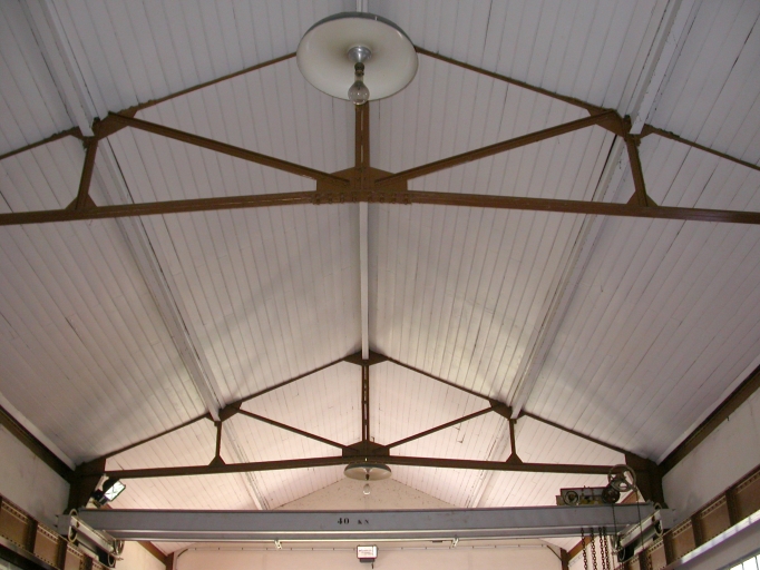 La salle des machines, vue intérieure : détail du plafond lambrissé et de la charpente métallique.Immatriculation