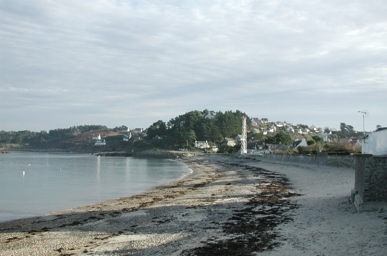 An Aod Vras : plage de sable et de galets : ancien cordon littoral aménagé, pylone du phareImmatriculation