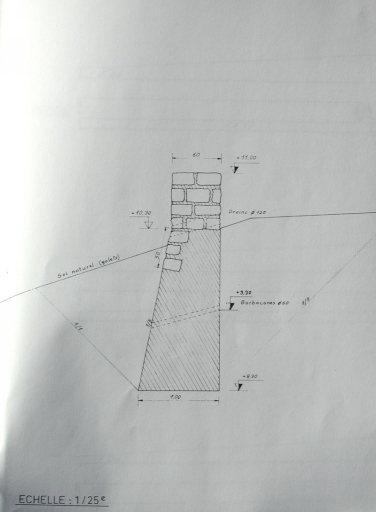 Dessin : construction d'un mur de protection et d'accotement d'un banc de galets sur le chemin départemental n° 88 en 1975 (Jean-Pierre Pinot)Immatriculation