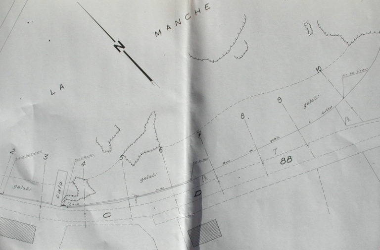 Dessin : construction d'un mur de soutènement, travaux de défense contre la mer entre 1975 et 1990 (Jean-Pierre Pinot)Immatriculation