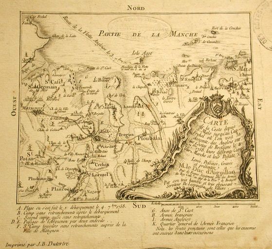 Carte de la côte de Saint-Malo jusqu'au Cap Fréhel où l'on voit la descente des Anglais sur les côtes de Bretagne le 4 septembre 1758, leurs différents camps, leur marche et leur défaite. Levée, dessinée, gravée et présentée à M. le Duc d'AiguillonImmatriculation