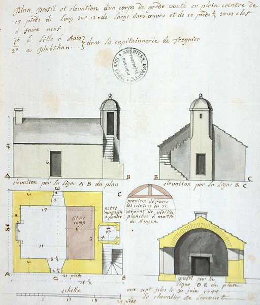 Plan, profil et élévation d'un corps de garde voûté en plein cintre destiné à l'île à Bois (commune de Lézardrieux) et à Pleubian (Côtes-d'Armor), fait aux Sept-îles le 30 juin 1744 par le chevalier de LescouëtImmatriculation