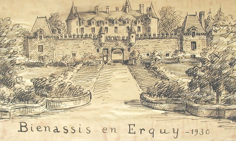 Château de Bienassis : vue générale en 1930 d'après croquis du vicomte Henri Frotier de La Messelière (AD 22)Immatriculation