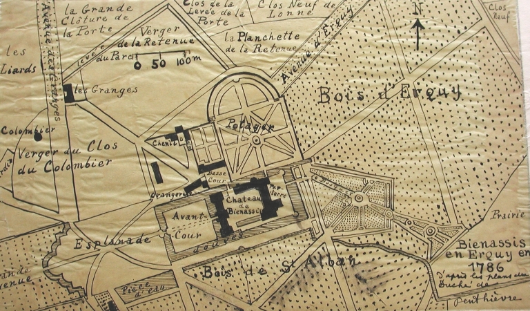 Château et domaine de Bienassis en 1786 d'après le cadastre de Penthièvre relevé en 1930 par le vicomte Henri Frotier de La Messelière (AD 22)Immatriculation