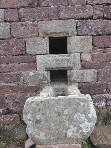 Vue de détail de l'élévation nord : regard de contrôle (en haut) et sortie des boulets (état en 2004). La goulotte de réception remploie le fût en granite d'une croixImmatriculation