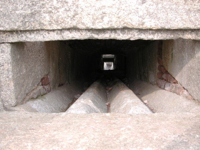 Vue intérieure : ouverture de chargement des boulets dans les trois rainures inclinées en granite (état en 2004). Les rainures guidaient les boulets vers le foyerImmatriculation
