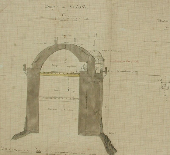 Projet de phare en 1882 à Fort-La-Latte : coupe du donjon avec projection de la tête de la tourelle (AD 22)Immatriculation