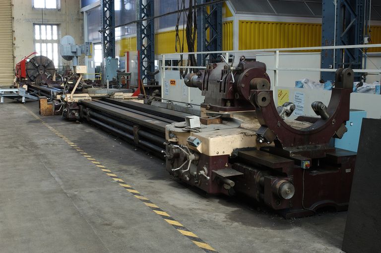 Vue de la halle d'usinage : tour Somua de 22 mètres de longueur, détail (1957)Immatriculation