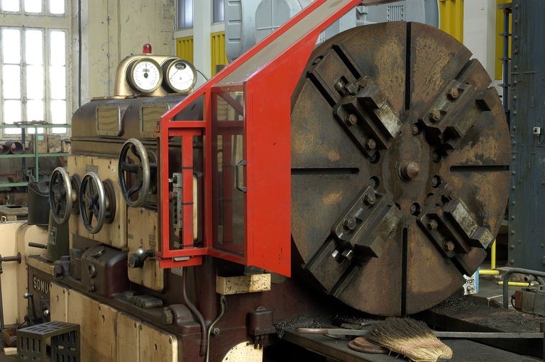 Vue de la halle d'usinage : tour Somua, détail (1957)Immatriculation