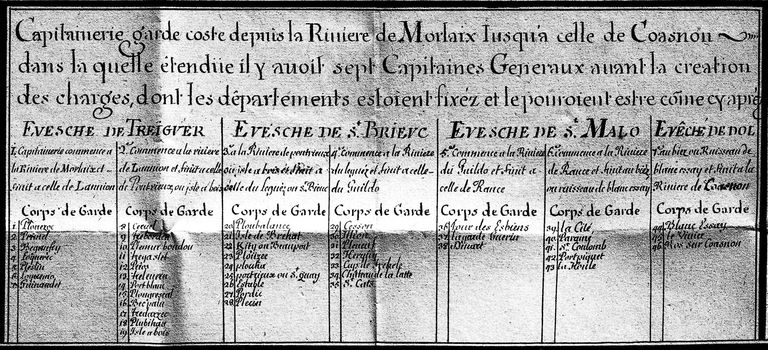 Tableau des capitaineries garde-côte de Tréguier, St-Brieuc, St-Malo et Dol dressé par Garangeau le 29 septembre 1716 à Saint-Malo, agrandissement cliché inventaire Artur/Lambart n° 83. 29. 137 P, Service Historique de l'Armée de Terre, VincennesImmatriculation