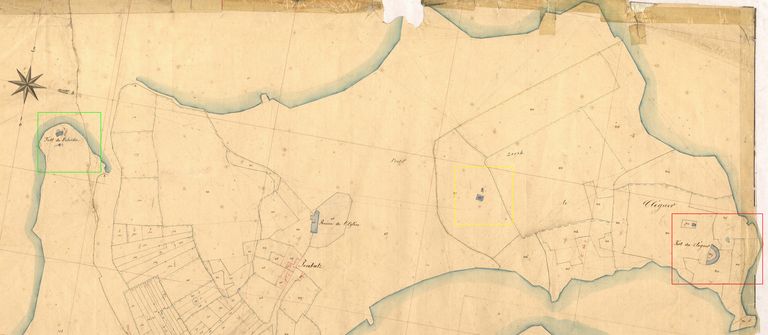 Extrait du cadastre parcellaire de l'Île-de-Batz : corps de garde de la Grande Roche (en jaune), batterie de côte de Bilvidic (en vert) et batterie de côte et magasin à poudre de Penn ar C'hleguer (en rouge), 1846Immatriculation