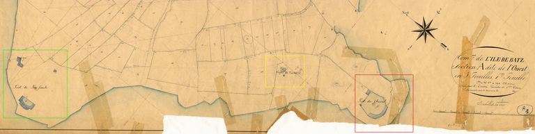 Plan de situation du corps de garde Ouest (en jaune), des batteries de Beg Séac'h (en vert) et de la batterie du Grand Chenal (en rouge, remaniée au 19e siècle), extrait du cadastre ancien, 1846, Archives départementales du FinistèreImmatriculation