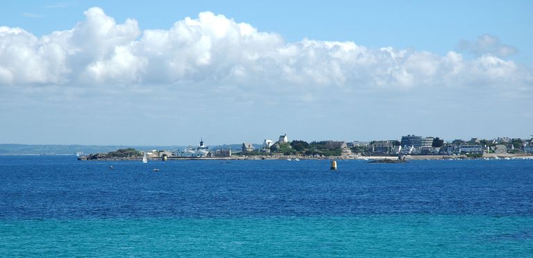 Vue de Roscoff depuis la pointe de Bilvidic : en arrière-plan à gauche, le Château du Taureau distant de 11 kmImmatriculation