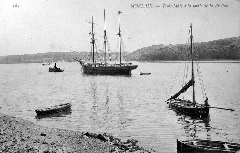 Morlaix : vue de la rivière : un trois mâts en remorque, en arrière-plan, le Dourduff, carte postale ancienne, Bibliothèque Municipale de MorlaixImmatriculation