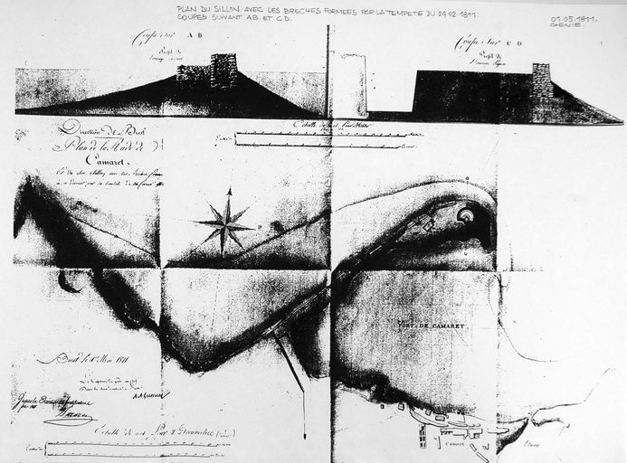 Plan du sillon avec les brèches formés par la tempête du 24 février 1811, coupe suivant A-B et C-D, Génie, fait à Brest le 1er mai 1811 et approuvé par Barazer, Directeur des fortificationsImmatriculation