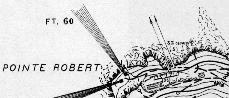 Détail du plan de situation des batteries de Robert et du Stiff : batterie du fort Robert (batterie casematée de 32 cm, projecteur de 90 cm FT, projecteur de 60 cm FT), Atlas des batteries de côte : côte de Brest, 1913, VincennesImmatriculation